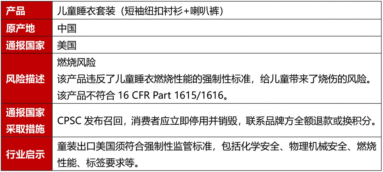 2025年9月11日,美國公布1起兒童睡衣召回案例。這些產(chǎn)品違反了兒童睡衣燃燒性能的強制性標準,給兒童帶來(lái)了燒傷的風(fēng)險。
