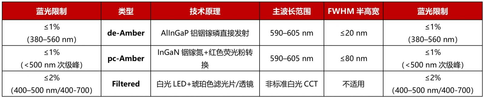 pc-Amber:熒光轉換型(寬帶琥珀光,藍光占比≤1%)。