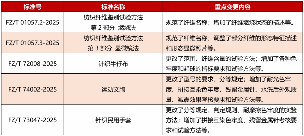 2025年,中華人民共和國工業(yè)和信息化部、國家市場(chǎng)監督管理總局(國家標準化管理委員會(huì ))發(fā)布了一批紡織品、服裝及相關(guān)產(chǎn)品的檢測方法與執行標準的新版本。新版本2027年開(kāi)始實(shí)施,在實(shí)施日期前的兩年多過(guò)渡期內,新舊版標準可并行使用。主要內容匯總如下: